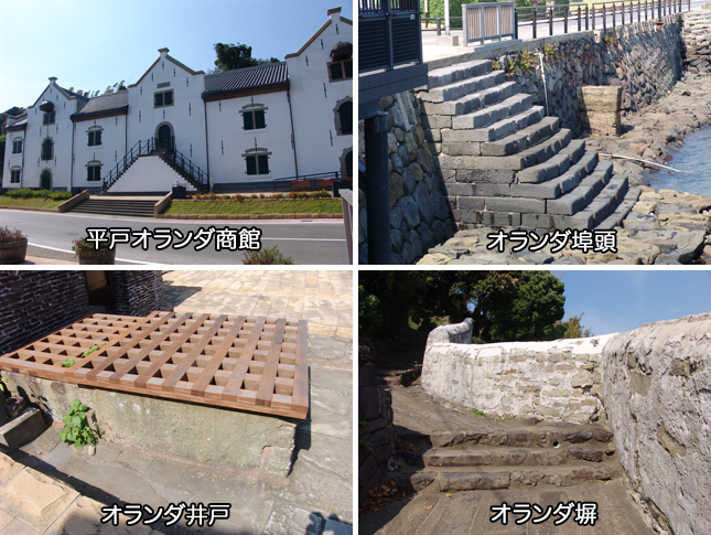 江戸時代にオランダ東インド会社の日本における出先機関としてこの場所に設置されました。1609年に平戸に設置され、1641年に長崎の出島へ移転しました。現在は、当時商館の建物復元、環境整備を行い、新たな歴史スポットして人気を博しています。
